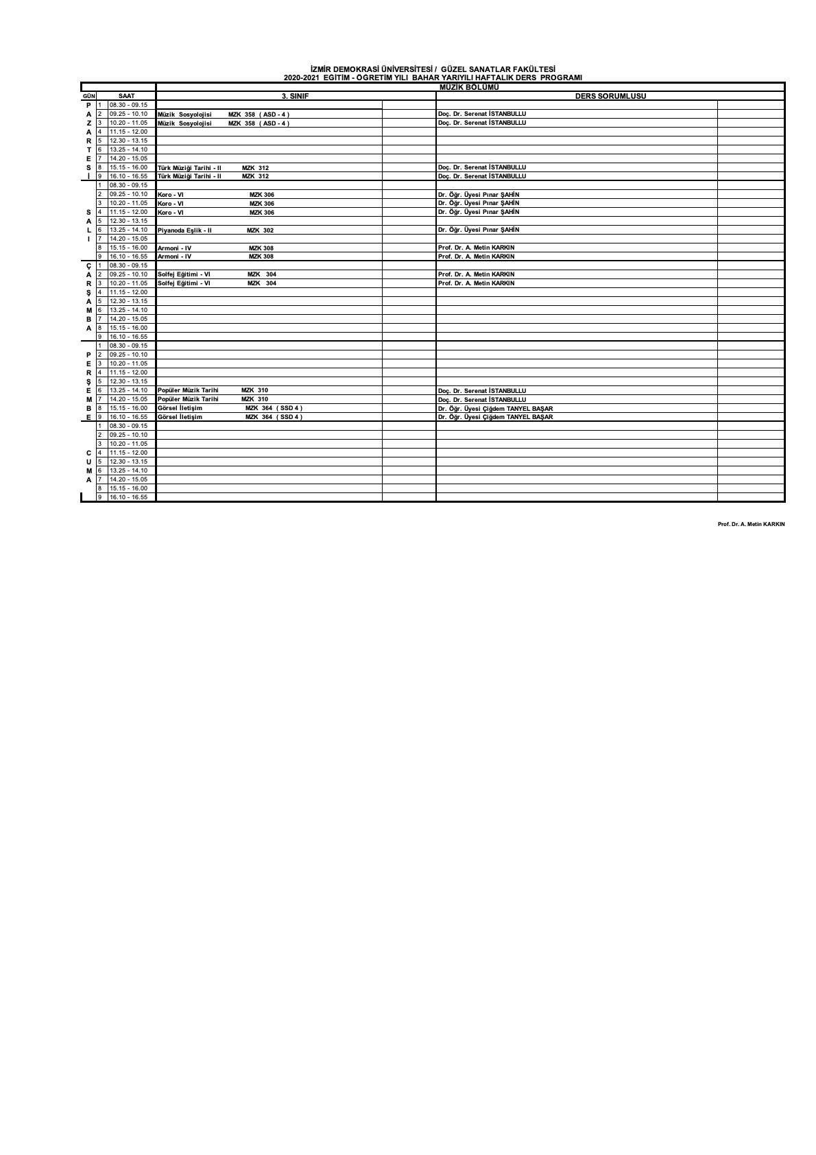 Müzik Bölümü 2020-2021 Bahar Yarıyılı 3. Sınıf Ders Programı için