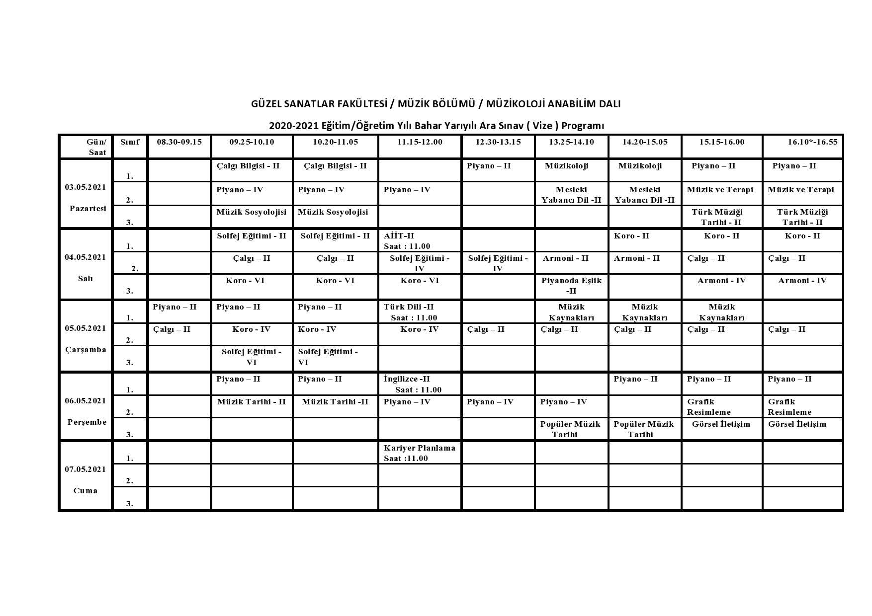 Müzik Bölümü 2020-2021 Bahar Yarıyılı Ara Sınav tarihleri için