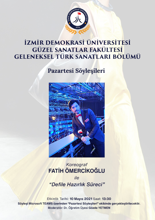 İzmir Demokrasi Üniversitesi Güzel Sanatlar Fakültesi Geleneksel Türk Sanatları Bölümü Pazartesi Söyleşileri kapsamında Koreograf Fatih ÖMERCİKOĞLU 10 Mayıs 2021 Pazartesi günü konuğumuz olacaktır.